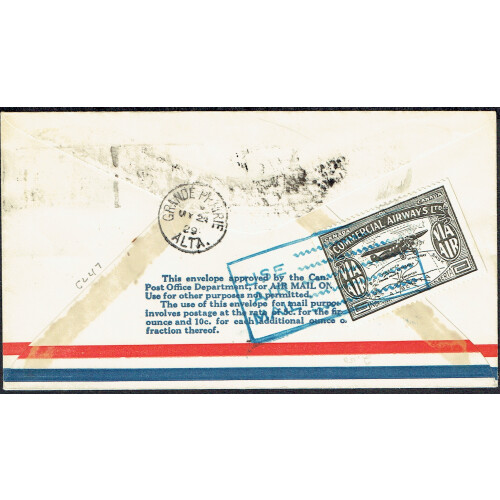 1929 (21 May) Printed airmail cacheted cover Edmonton to Grande Prairie to Alberta, bearing GV 2c green defin tied by ADVISE CORRESPONDENTS OF YOUR CORRECT ADDRESS slogan cancel and CANADA COMMERCIAL AIRWAYS / VIA AIR NORTHERN ALBERTA label in black on reverse tied by USE AIR MAIL boxed h/s in blue along with arrival b/s. Fine. Unitrade CL47.