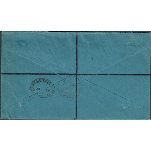 Officials: 1929 (July) Dark blue printed OHMS registered cover Windhoek to UK bearing 2d pair (right marginal) showing no stop after official variety and two 1d pairs each tied d/r WINDHOEK cds cancels. A little roughly opening and hinge marks on reverse but striking official use rate x 15 on cover. SG O6/7a. Huge cat value.