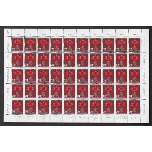Pro-Juventute: 19467 Alpine Flowers 20c + 10c & 30c + 10c both in attractive unmounted mint complete sheets of 50 with sheet imprints and sheet number, fine, SG J122/3. Cat £245.