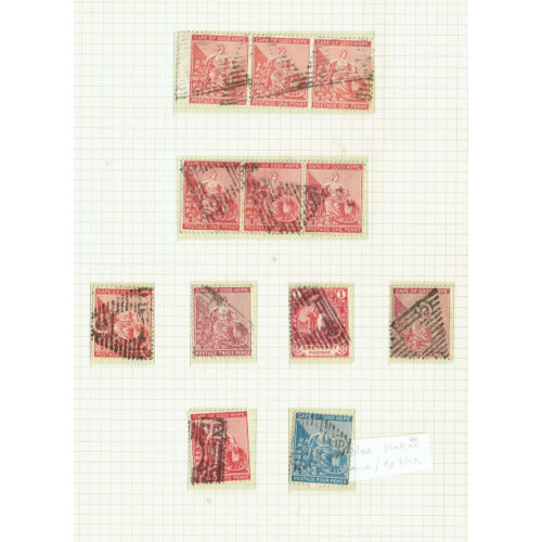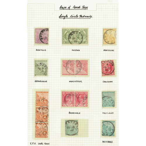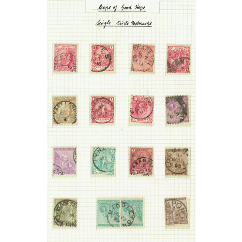 POSTMARKS Collection on leaves on Sitting Hope issues from different printings each selected for postmark interest incl small barred triangles on 1d strip of 3 (2), duplex numerals (c33), cross pmk, cds cancels (c90) incl a part RORKES DRIFT cds in 1903, Mafeking single cds, Parcels cds and dumb cancels some in blocks of 4 or 6, a few telegraphs cds, 1904 2d brown in a large block of 15 plus strip of 3 with Graaf Reinet cds's, etc, intr lot.