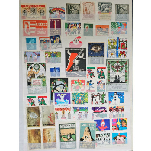 Stockbook (16 sided) with a good range of mainly all different poster stamps, advertising labels perf, imperf mainly mint, few GB Machins with P.O. Training bars, lots of different countries mainly from 1910 to modern. Approx 500+.