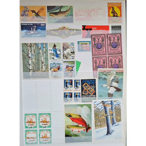 Stockbook (16 sided) with a good range of mainly all different poster stamps, advertising labels perf, imperf mainly mint, India revenues, telegraphs, 1854 crude reproduction of 4a in blk of 4 (2), few GB Machins with P.O. Training bars, lots of different countries mainly from 1910 to modern. Approx 500+.
