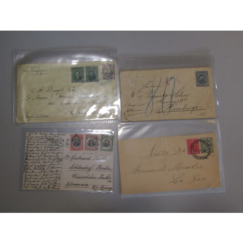 Bolivia: Thirteen covers early to modern with interesting incl 1901 5c uprated P/S env to La Paz, 1900 5c P/S env used to Germany, 20c black and purple P/S env uprated to London, or Germany, 1913 5c P/S env uprated to Germany cancelled large oval violet d/s, 1913 to Switzerland, two regd covers from Mercantile Bank to UK, printed Radio cover to USA one stamp bisected etc. (13).