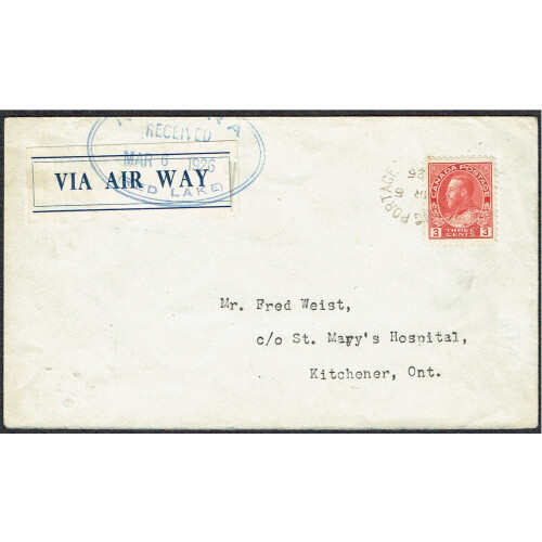 1926 Jack V Elliot / AIR SERVICE / First Red Lake Aerial Mail red on yellow label (CL6) tied to cover on reverse with 1926 6 Mar KENORA oval d/s in blue tied along with ROLLING PORTAGE cds, 3c carmine GV defin tied similar cds and VIA AIR WAY label affixed and tied KENORA oval d/s, typed addr to Fred Weist, C/O ST May's Hospital, Kitchener, Ont. Fine. This route served the 1926 Gold Rush.