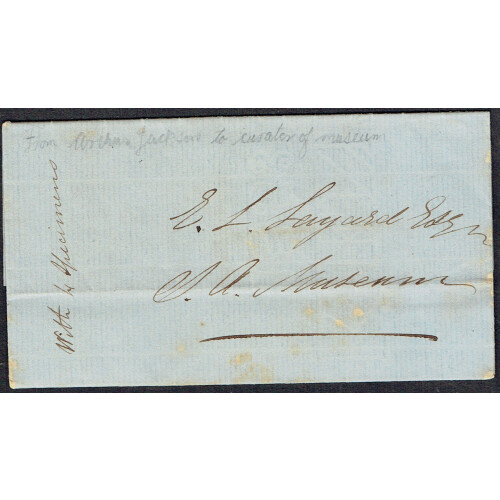 1856 (29 July) Entire Letter to Edgar Leopold Layard at the S. A. Colonial Museum regarding 4 Specimens of Hawk Moths from Nell's Post, bearing oval red CAPETOWN dated cancel, some aging spots sent from Arthur Jackson to the curator of the museum. No paid marks. Layard was a big name in Birds and authored The Birds of South Africa and a key figure in colonial science and specimen collecting and even corresponded with Charles Darwin. Intr letter.