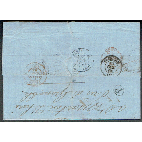 1864 Entire Letter in French to Paris unstamped sent Via Panama with 19 chargemark and transit through London to France. Indistinct VALPARAISO dated arc in black on reverse and GB / "f87 5c/10 accountancy mark. Tear and filing folds otherwise sound.