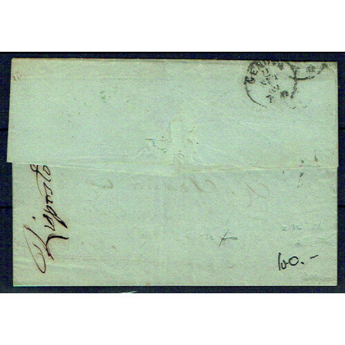1859 (27 Aug) Entire Letter from Malta to Genova from Italian business bearing GB 4d rose tied full strike of MALTA A25 cancel with trade h/s, PD in black circle and crayon 1¼ mark in red. Usual folds, attractive cover. SG Z47.