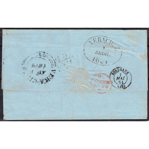 1861 (1 April) Entire Letter Veracruz to Bordeaux sent per steamer via Southampton with 8 charge mark and oval VERCRUZ 1 ABRIL 1861 on reverse in black alongside double arc VERA CRUZ in black on the same day. GB accountancy mark and Calais transit CDS with Bordeaux arrival b/s. Horiz. filing fold and age marks otherwise fine.