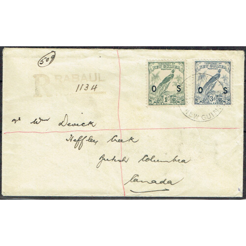 1937 Registered cover to Heffley Creek Br. Columbia, Canada. Bearing officials OS Type 3 on 3d blue and 1s pale blue-green tied single RABUAL CDS, multitude of transit and arrival backstamps, mainly fine, seldom seen on cover hence high cat value. SG O46, O52.