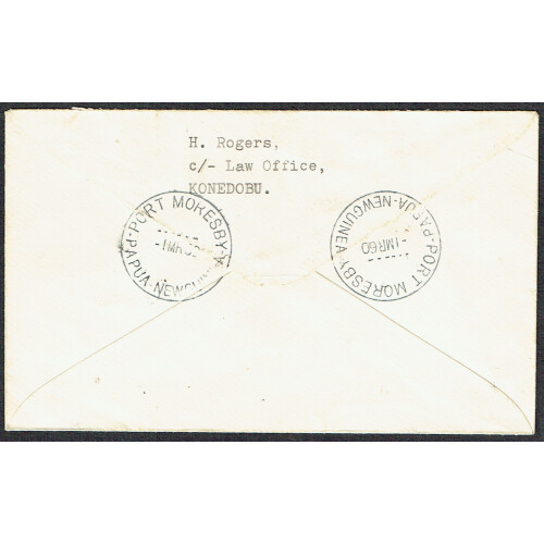 1960 (1 Mar) 6d on 7½d blue (red ovpt) used on First Day Cover sent by Law Office KONEDOBU philatelically produced by Eric Douglas while working for the Territory Dept of Works (well known Australian philatelist), provenance seller was the widow of Jim Stephens who said Eric prepared this cover himself. T 6d tax mark on obverse. Tear in top left corner, otherwise fine. SG D1.