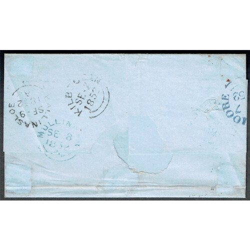 1841 1d red-brown pl.138, fine used four margin example (IK), tied to wrapper addressed to Ballinasloe by two blue Tullamore '438' numeral cancels with a blue Ballinasloe cds below. Backstamped at Tullamore, Kilbeggan and Ballinasloe. SG Spec B2 (1) xb. Rare item.