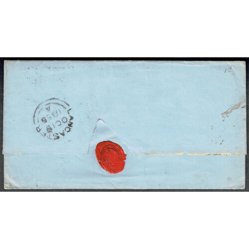 1855 1d red-brown pl.9 (Wmk LC Perf 14). Very fine used example lettered LK neatly tied to uncreased wrapper by a Manchester '498' type II sideways duplex for 18th October. Addressed to Lancaster with arrival backstamp. SG Spec. C3 (1).