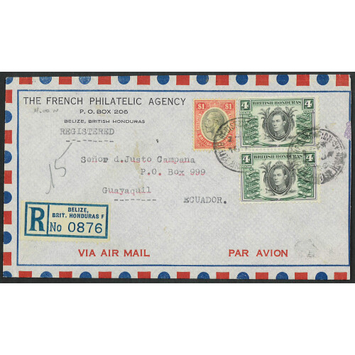1941-53 Four GVI covers bearing various multi franked covers to USA (2), UK or Jamaica each tied rubber oval double ring datestamps for CAYE CAULKER, BENQUE VIEJO (2, one from Guatemala Consulate), BAKING POT, useful group.