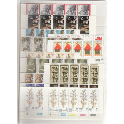 Unmounted mint collection of blocks and strips mainly with imprints or sheet markings for S. Africa 1979-1988, homelands including SWA 1981-3, Transkei, Bophuthatswana, Venda & Ciskei all 1981-1985 all in multi u/m blocks of 4 or strips etc, huge quantity well over 1500+.