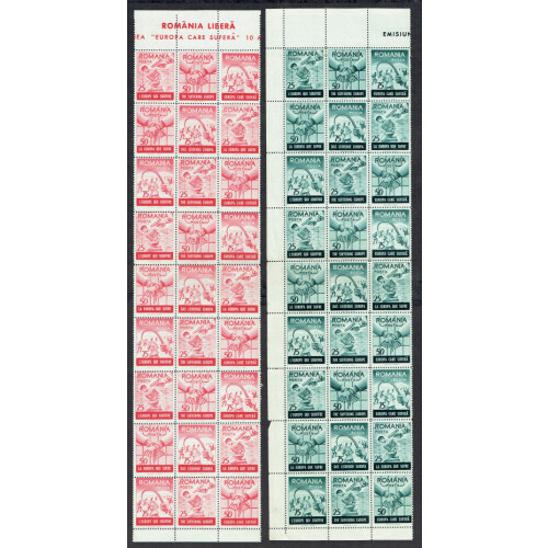 Romania Cinderellas: 1959 (10 May) Europe that suffers 3 values in 3 different colours unmounted mint stock of setenant blocks of 27 mainly of blue-green issue (26 blocks), Blue (7 blocks), red (3 blocks), each for face values of 2 x 25b, 3 x 75b & 3 x 50b. 15,000 blocks of 9 were printed. (972 labels).
