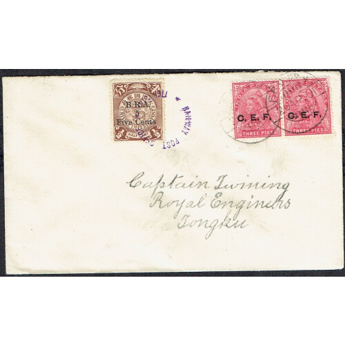 1900 British Railway Administration, India 3p carmine horizontal pair used on 1901 Captain Twining, Royal Engineers cover from Tienstin to Tongku tied by FPO No.4 (Apr 20) cds in black used in combination with China 1901 5c on ½c brown surcharged B.R.A. / 5 / Five Cents in black tied by circular Railway / Post / Office / Tientsin in violet. Reverse with FPO No.4 arrival cds (20 Apr). Superb first Day usage.