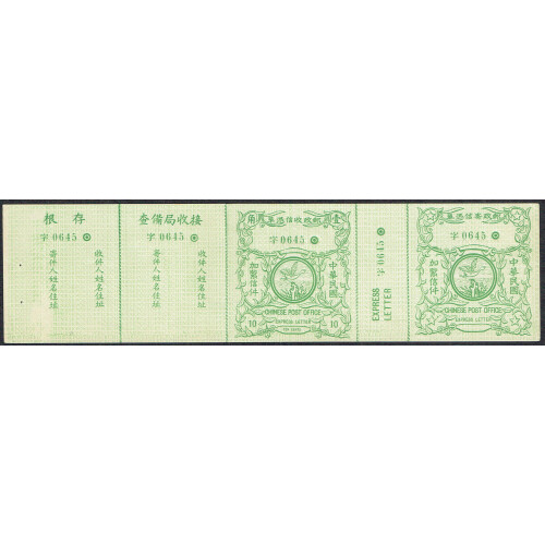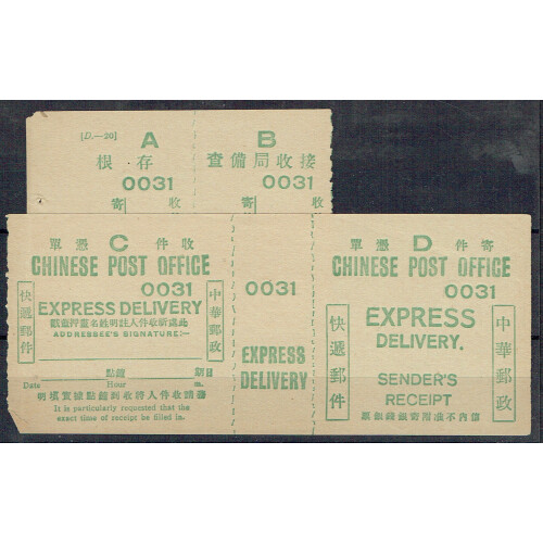 Express Letter: 1916 (Feb) Express Delivery later receipt unused in two parts in green on buff paper (form D-20) printed in green for part A & B, and setenant strip of three for parts C & D, serial number 0031. Minor faults.