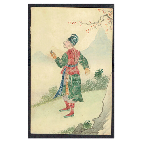 1932 Hand coloured postcard showing Chinese local made out of a montage of Canada GV stamps, paper adherence on reverse where stuck down to page. Minor tones.