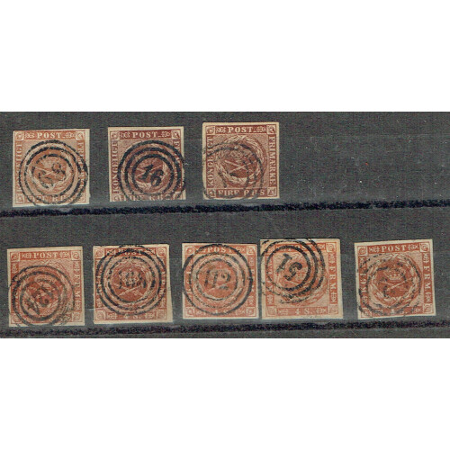 Classics range of 4rbs or 4sk brown including mostly four margin example with clear numeral concentric circle postmarks, 1853-4 4rbs (3), 1858 4sk x 5 various shades all four margin. (8).