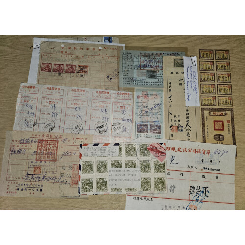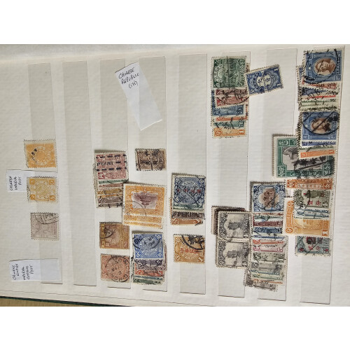 Extensive revenues duplicated collections in a well filled stockbook and postal forms in small piles includes dozens of different types noted Postal Savings, South Central Provisional ovpts, East China, Money Order with Great wall types, Famine Relief, Manchuria, Farming, Bonds, N. China revenue office, then lovely group on receipts and forms. Approx 1400+, scarce opportunity for a dealer or revenues collector.