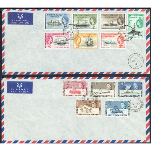 ISLAND BASES: 1950s-1970s Good collection of covers written up on leaves some with photos or pictures of the bases, the dates in use and handstamps used plus dates evacuated, noted ADMIRALTY BAY BASE G (5), DANCO ISLAND / BSE O (4), ANVERS ISLAND BASE N (3), PROSPECT POINT BASE J (2), MARGUERITE BAY BASE E incl STONINGTON ISLAND (5), HOPE BAY (8), PORT LOCKROY BASE A (5), HORSESHOE ISLAND BASE Y (4), LOUBET COAST BASE W (4), intr lot. (c40).
