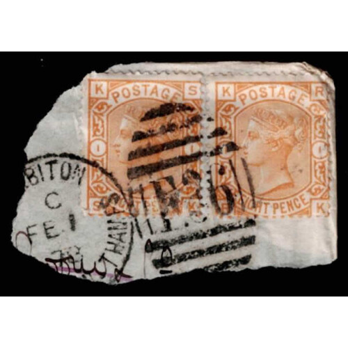 1876 8d orange, two singles on piece tied by F36 Surbiton duplex, wrinkles at top corners, SG 156. Cat £1250.