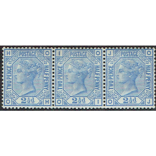 1881 2½d blue plate 22 in a mint / unmounted mint strip of three, two stamps are U/M, very fine, SG 157.