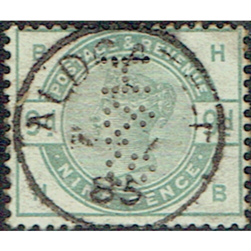 1883 9d green (good colour) a neat perfinned example with superb cds cancel, fine, SG 195.