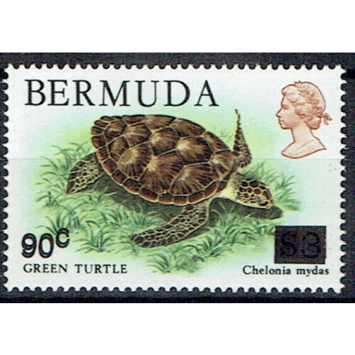 1986 25th Anniv. of World Wildlife Fund 90c on $3 green turtle showing black surcharge overprint double variety, fine U/M, SG 534a.