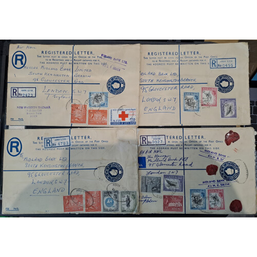1962-3 Three 30c dark blue registered postal stationery envelopes each to London uprated with various defins and commems to 5s to Midland Bank. Tied ADEN GPO registered ovals, third cover from CRATER with regd etiquette No.0327. Pretty group (4 covers).