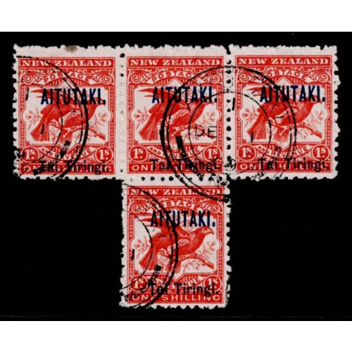 1903-11 1s bright red in an attractive strip of three fine used AITUTAKI 1909 cds's. Small stain top left, SG 7.