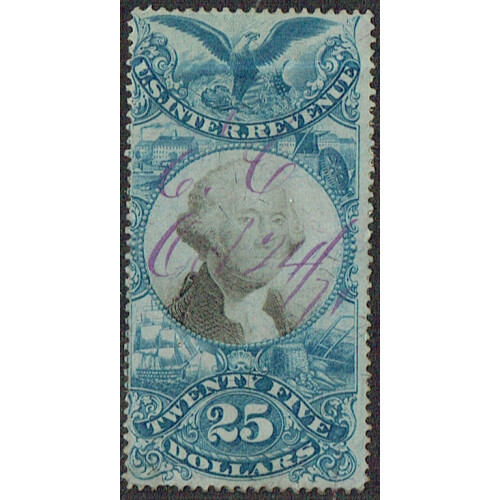 USA: Internal Revenue $25 blue and black neatly pen cancelled in violet ink, very sound for these, Scott R130.