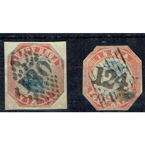 India Used in: 1854 4a blue and red neatly cut to shape with clear strike of 124 numeral cancel used in Aden, age rust spot, scarce. SG Z9 Cat £2500. Also similar C/I30 of Cochin.