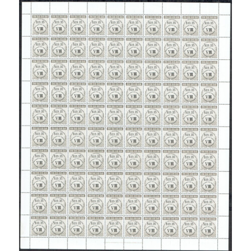 Trinidad & Tobago: 1990 National Insurance $19.35 sepia in complete sheets of 100 unmounted mint, Barefoot 19. Stock of 16 sheets. Barefoot £8,000. Only 2% cat.