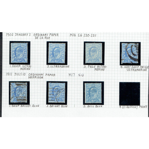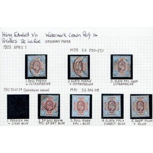 1906-1911 Mint, unmounted mint & used assembly of shades identified by SG specialised numbers includes 1911 1d rose-red (6 diff), 2½d mint (3 diff U/M), 3d purple on lemon mint, 3d cds used (3 diff one stated as broken frame taken 'as is'), 4d bright orange mint, very deep orange mint (U/M), deep bright orange cds used. 1906 5d dull purple and ultr. mint, slate purple used, plus pair cds used. 1910-12 7d grey black mint (5 shades one rule gutter margin some are unmounted). (29). High cat value.