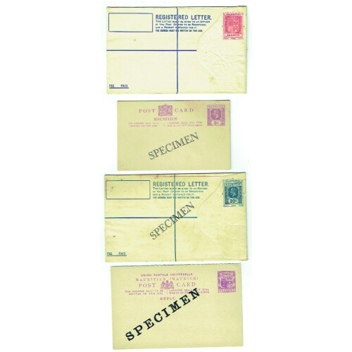 SPECIMEN Overprints on Queen Victoria, EDVII, GV (2), postal stationery cards & envelopes. Includes Arms 6c, 10c, 12c, 12c red registered P/S env., GV 3c lilac, 20c blue registered P/S env., few tones otherwise nice group of 6 items.